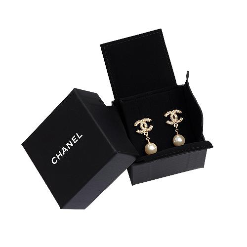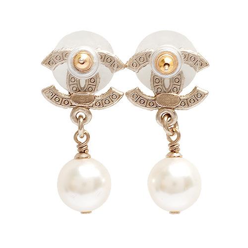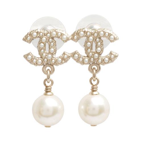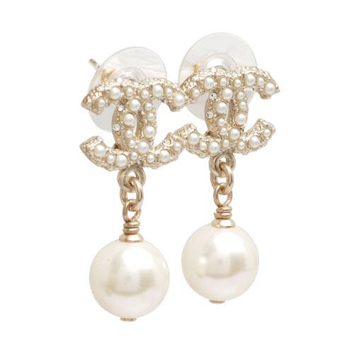 CHANEL 香奈兒經典CC LOGO 大小珍珠鑲嵌垂墜穿式耳環(金)